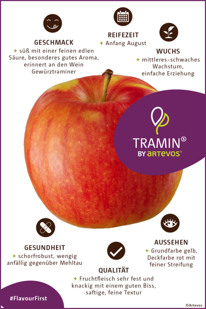 Der Name verrät nicht nur die Herkuft der Apfelsorte aus dem bekannten Südtiroler Dorf, sondern verspricht ebenso Geschmacksnoten wie der gleichnamige Gewürztraminer: aromatisch, würzig, süß, aber gleichzeitig mit einer edlen Säure. Ein sehr gesunder Sommerapfelder schorftolerant (schorfresistent Rvi6) und nur wenig anfällig für Mehltau ist. Die Äpfel reifen schon ca. eine Woche vor Gala, im Südtiroler Unterland Anfang August, und zeichnen sich durch ihre besonders lange Haltbarkeit aus – im Kühllager bis Weihnachten. Die kugeligen bis platten Äpfel sind sehr knackig, saftig und haben einen guten Biss. Die Grundfarbe ist gelb mit einer attraktiven, hellrot gestreiften Backe.
