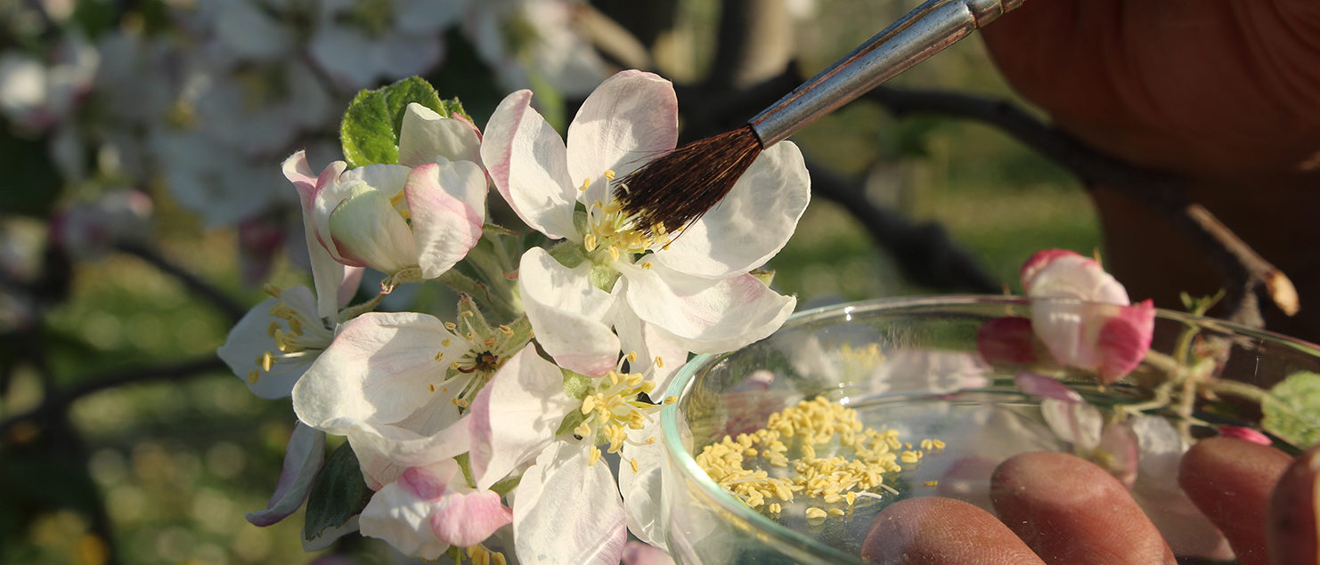Sabine Fey Die Wahrscheinlichkeit ist relativ gering, dass eine Kreuzung auf Anhieb funktioniert. Man hat es durch die jahrhundertealte Methode der Kreuzzüchtung nicht in der Hand, welche Eigen-schaften von den Eltern tatsächlich weitergegeben werden an die „Kinder". Im Endeffekt ist es ein Glücksspiel, ob die eine oder andere Eigenschaft tatsächlich im neuen Sämling vorhanden ist oder nicht. „Gut Ding will Weile haben" – ein sehr treffender Ausspruch im Zusammenhang mit der Züchtungsarbeit für Obstsorten. Denn nach der Auswahl der geeigneten Eltern und der Bestäubung der Blüten geht die Arbeit erst richtig los. Die aus den bestäubten Blüten entstandenen Samen werden ausgesät und die Pflanzen werden in den nächsten Jahren intensiv beobachtet. Krankheitsanfällige Pflanzen und Pflanzen mit Früchten, die den Anforderungen nicht entsprechen, werden aussortiert – übrig bleiben meist nur eine Hand voll Favoriten, die über viele Jahre weiter beobachtet und auf ihre Anbaueignung geprüft werden. Nach dieser langen Zeit kristallisiert sich häufig nur eine einzige Sorte heraus, die dann tatsächlich vermehrt und auf den Markt gebracht wird. Denn neben den gesetzten Zuchtzielen sollen auch alle anderen Merkmale stimmen, wie die Fruchtgröße, Qualität, Lagerfähigkeit, etc.