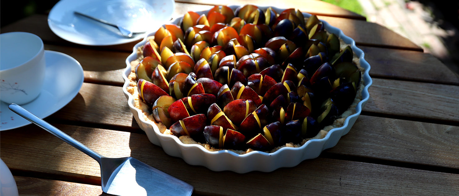 In the meantime, remove the stones from the plums and cut them crosswise (up to half). When the dough is pre-baked, remove the piepan and spread the plums evenly, start at the edge and continue to the mid. (If you want sprinkles over the cake, simply increase the ingredients by 1/3 each, remove 1/4 of the quantity from the piepan and scatter it at this point over the plums.) Then put the cake back in the oven for about 20-25 minutes. (If sprinkles are starting to get too dark, the temperature should be reduced to 165°.)