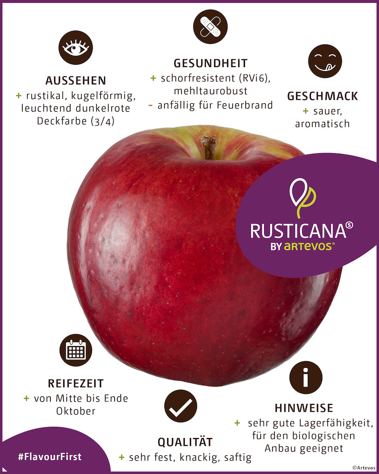 Rusticana[S] verweist mit seinem Namen nicht nur auf das rustikale Aussehen, sondern spielt damit auch auf die hervorragende Vitalität dieser Apfelsorte an: Sie ist schorfrobust (schorfresistent Rvi6), mehltaurobust und robust gegenüber Marssonina. Die Bäume bringen ein sehr einfaches Baummanagement mit sich, sowie hohe regelmäßige Erträge. Die Früchte sind leuchtend rot und sortentypisch berostet. Auch geschmacklich überzeugt die Spätsorte mit ihren aromatisch, knackigen und säuerlichen Früchten, die sich zudem sehr gut lagern lassen.